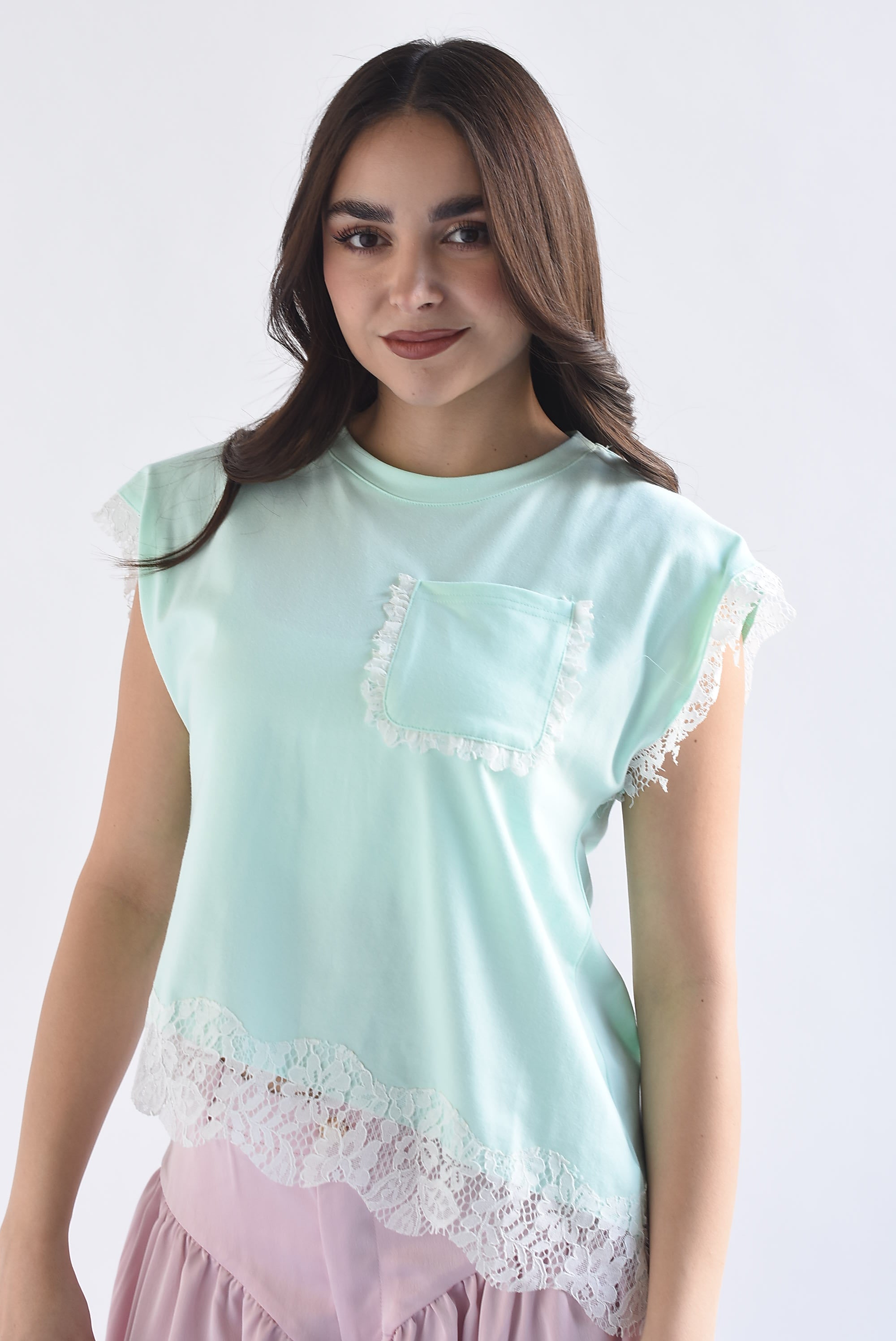 Nuevo T-Shirt asimétrica bolsillo tira encaje