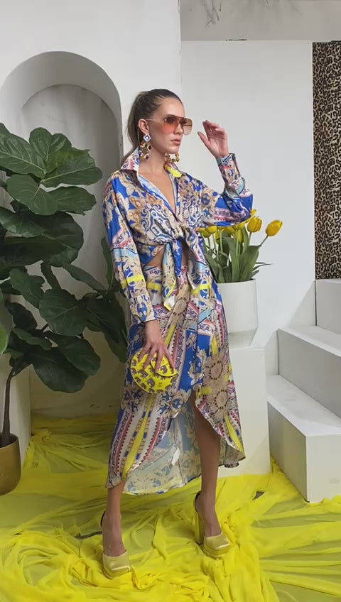 Conjunto de Falda tipo pareo, con botones en cintura. Camisa de manga larga con botones frontales. En material ligero y estampado